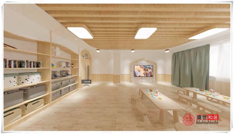 本案為安徽盛世和居裝飾承接的伊貝幼兒園裝修項(xiàng)目的設(shè)計(jì)效果圖。合肥幼兒園裝修公司的設(shè)計(jì)師在用色上,基本使用了白色及原木色兩種色調(diào)。白色是萬(wàn)能搭配色,而原木色調(diào)的材質(zhì)能給幼兒園一種接近大自然的感覺(jué)。因?yàn)樵旧≈谀静?,其紋理的美感以及木材本身散發(fā)出木質(zhì)的特有香氣都能讓人感覺(jué)溫馨舒適。